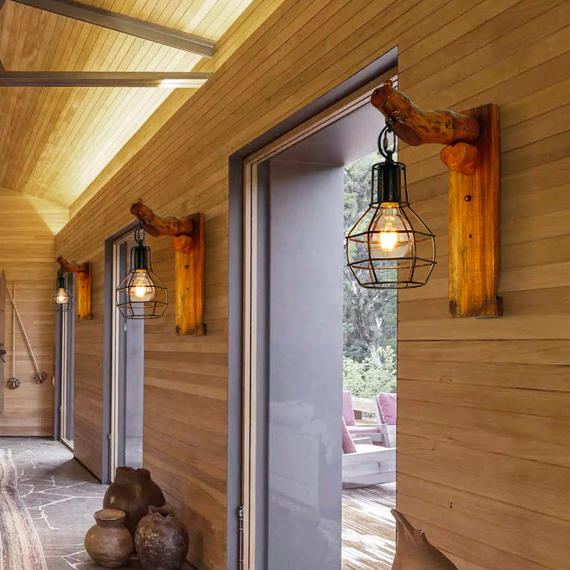 Rustic Metal Wall Lamp With Wooden Backplate - Vintage Style Sconce Light For Bedroom Black Finish 1