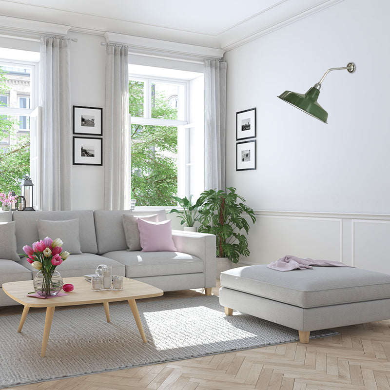 This is a wall light that would look great in a living room. It is made of metal and has a green barn shade. The light is not included, but it takes an E26/E27 bulb. It is 14"/16" in diameter.