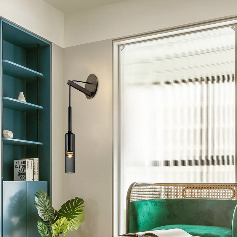 This 1 light wall mounted light features a black arm and a smoke grey crystal sconce. The sconce is simple in design and the light is encased in a clear glass cylinder. The light is powered by direct wired electric and the voltage is 220V-240V 110V-120V. The light type is LED/Incandescent/Fluorescent and the power source is direct wired electric. The fixture height is 15 to 19 inches and the overall height of the light is 19.5 inches. The width of the light is 3 inches and the depth is 6 inches. The light bulb is not included.
