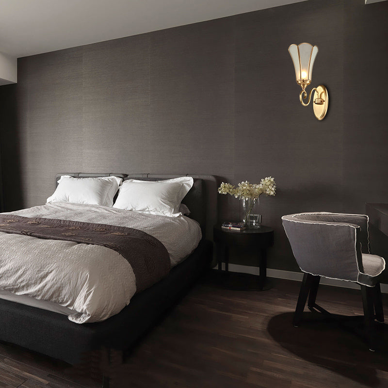 Floral Living Room Wall Lamp - Traditional Metal Design with Brass Finish & White Bevel Glass Shade
