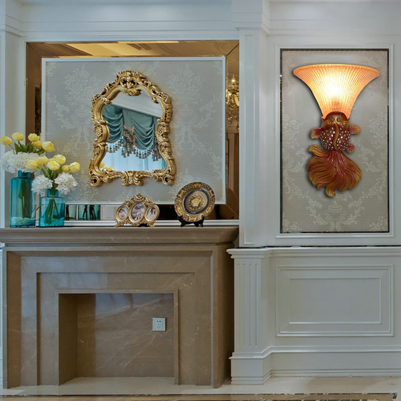 Stylish Resin Fish Shape Wall Mount Light - Red/Gold 1-Light Sconce Fixture with Amber Glass Bell Shade