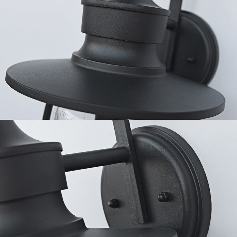 This product is a wall light that comes in the vintage black color with clear seedy glass. It is armed with one bulb and has a height of 16.5". The shade width is 9" and the backplate width is 5". The fixture depth is 10". This product does not come with a bulb, but the base is E26/E27.