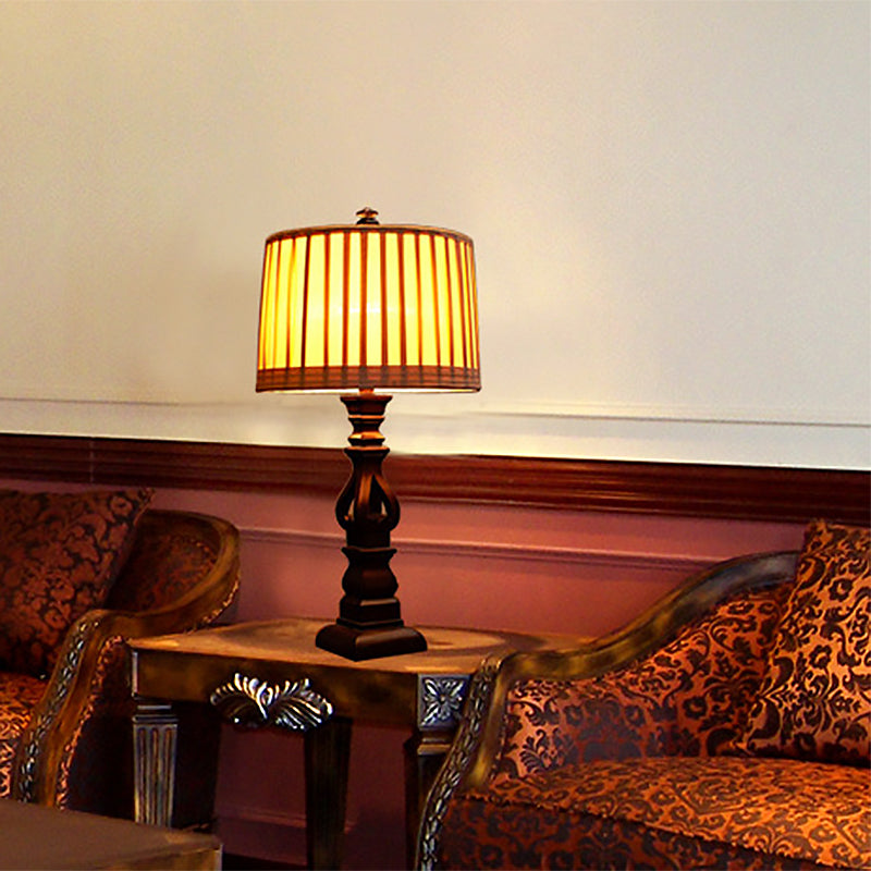 Rustic Red Brown Pleated Fabric Table Lamp: 1 Head Drum Shade Nightstand Light For Living Room