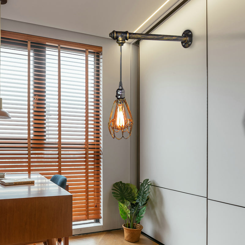 Rustic Antique Brass Caged Wall Lamp with Pipe - Dining Room Light Fixture