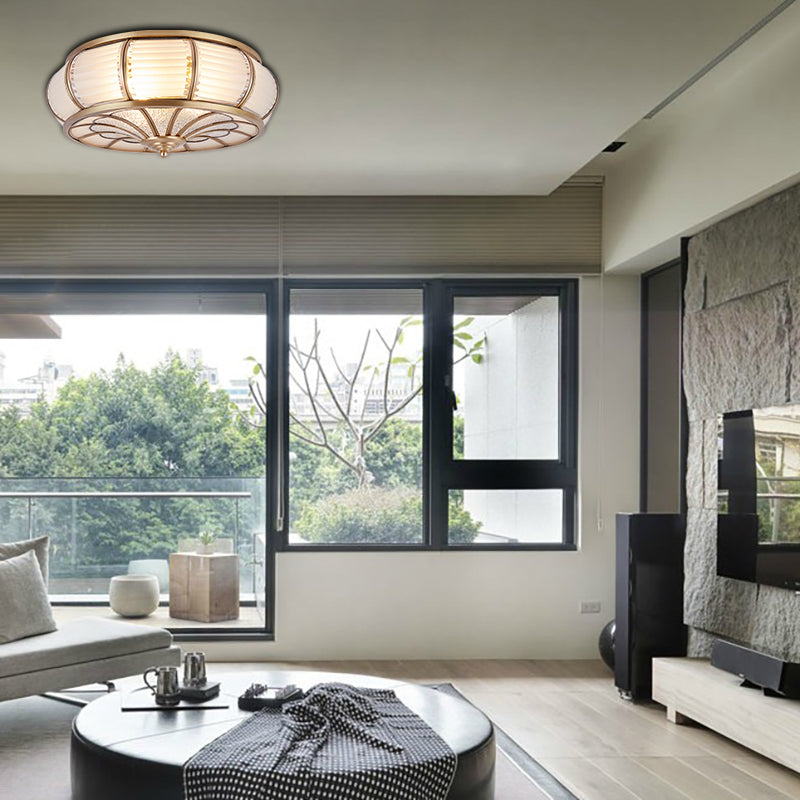 Colonial Cream Glass Drum Ceiling Lighting - 3/4 Heads Flush Mount Fixture Brass Finish
