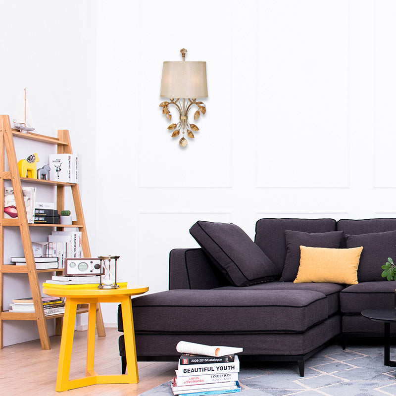This product is a modern cone wall sconce. It is composed of a metal frame in a brass finish and features two amber crystal leaf branches. The shade is fabric and measures 11 inches wide. The height of the sconce is 21.5 inches, and the fixture itself is 20 to 24 inches in height. It requires direct wired electric power and is not battery operated. This sconce can be used with either LED, incandescent, or fluorescent bulbs.