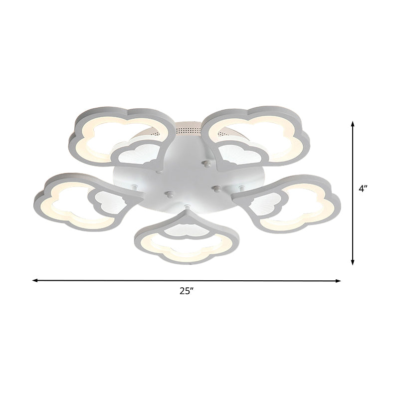 This product is a 3/5/12-Head LED Bedroom Flush Light with Flower Acrylic Shade White Ceiling Mounted Fixture in Warm/White Light. It is made of acrylic and features a modern style. The light is dimmable and can be controlled with a remote. It includes a mounting hardware kit.