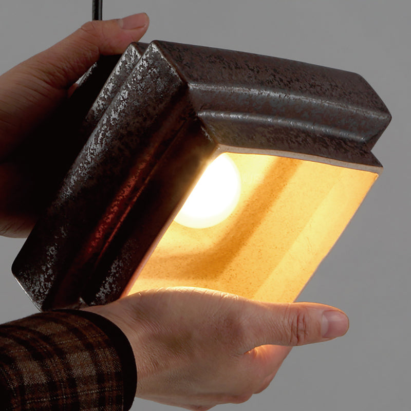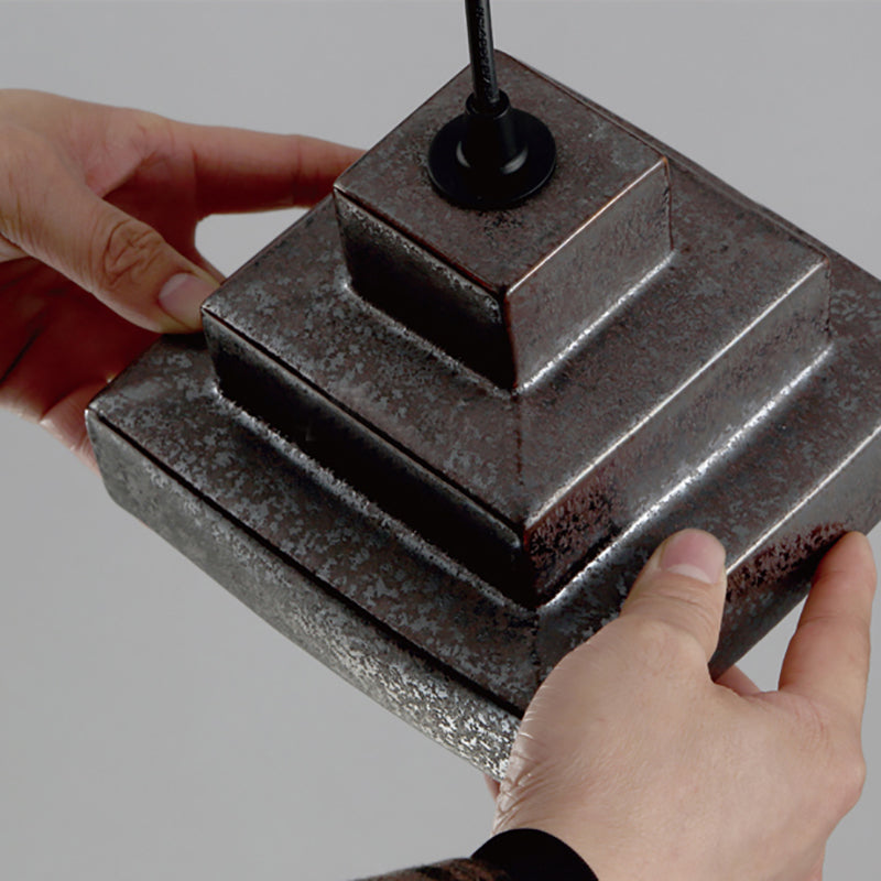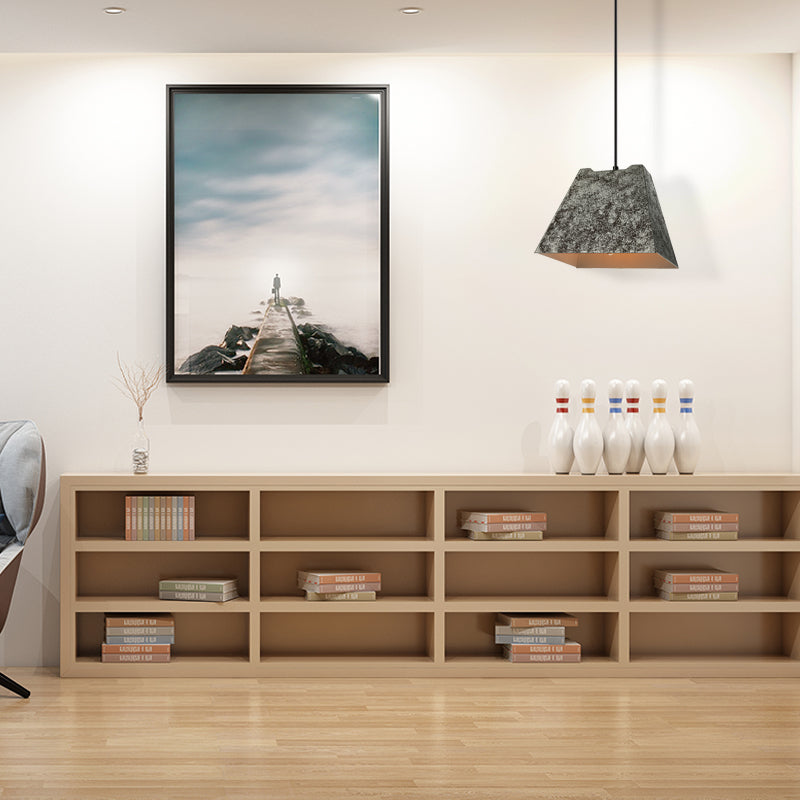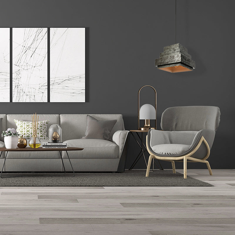 This 4 light pendant light fixture is made of metal with an aged black finish. The industrial style hanging light is 10-14 inches in size, with a 10 inch width and height. The fixture comes with a 59 inch chain/cord length and a 5 inch canopy width. The light requires an E26/E27 bulb base (not included) and is compatible with LED, incandescent, or fluorescent bulbs.