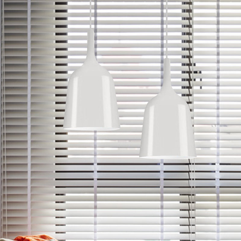 Bell pendant lighting is a type of pendant light that takes on the shape of a bell. This product is 6", 8", or 10.5" wide, making it perfect for small to medium sized spaces. It hangs from the ceiling with a round canopy and is available in black, white, chrome, or gold. It can be used with a LED, incandescent, or fluorescent bulb.