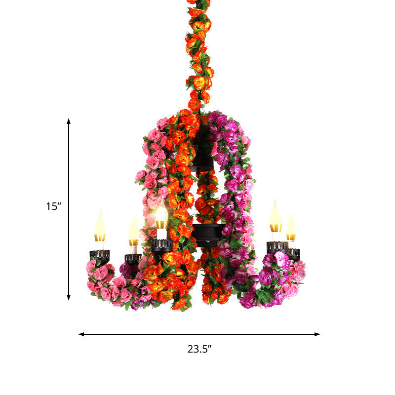 This industrial metal hanging chandelier light is a great addition to any restaurant. It features 6 lights, a curved arm, and a purple flower decoration. The light is LED, and the voltage is 220V-240V 110V-120V. The bulb base is E12/E14.