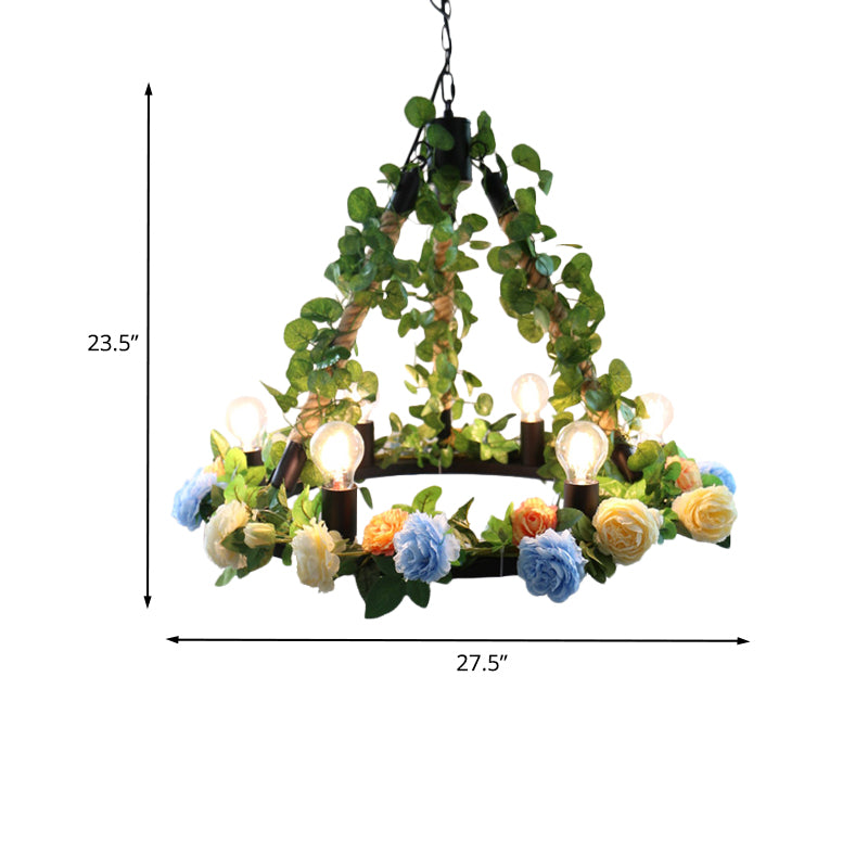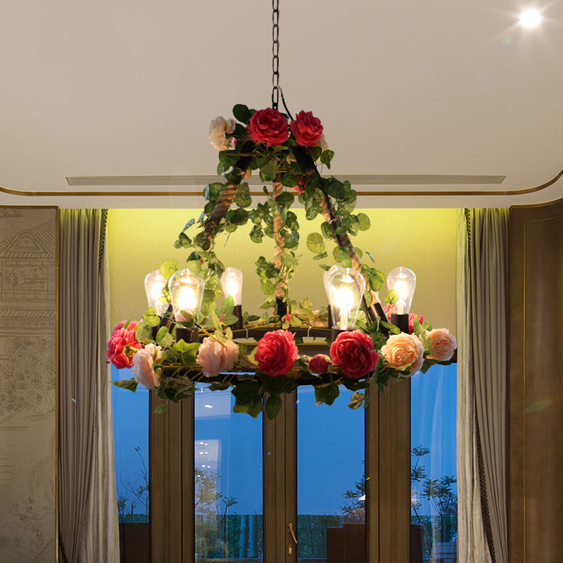 Aldhanab - Metal 6 Lights Exposed Bulb Chandelier Lamp Loft Style Black Metal Pendant Light with Ring and Artificial Petal Deco