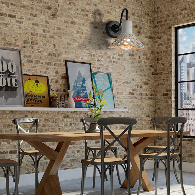 This wall light has a simple, sleek design that would look great in any modern setting. It is made of cement and has a grey finish. It is 9.5" tall and 8.5" wide. The light is powered by direct wired electricity and has an E26/E27 bulb base. It does not come with a bulb included. This light fixture can be mounted in a variety of ways, either by using the gooseneck arm or by sticking it directly to the wall.