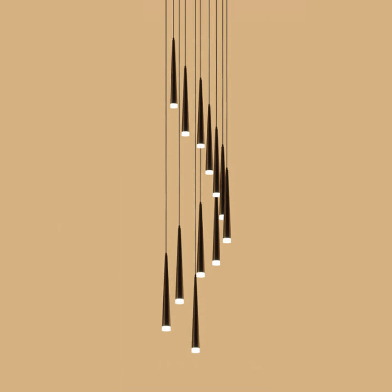 This is a black acrylic hanging lamp in a cone shape with 9, 12, or 18 lights. It has a contemporary spiral design and is meant to be hung on a stairway. It can use LED, incandescent, or fluorescent bulbs (not included). The fixture width is 19.5-23.5 inches, the fixture height is 79-118 inches, and the canopy shape is round.