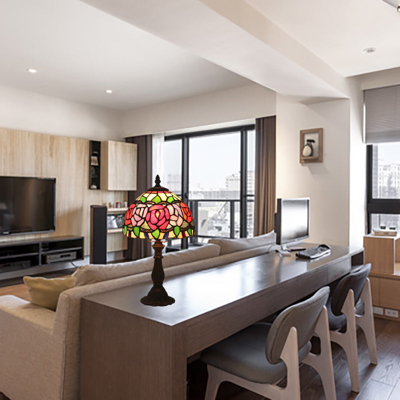 Antique Brass Single Head Night Table Lamp with Mediterranean Stained Glass in Pink Rose/Red Rose/Tulip Design for Nightstand