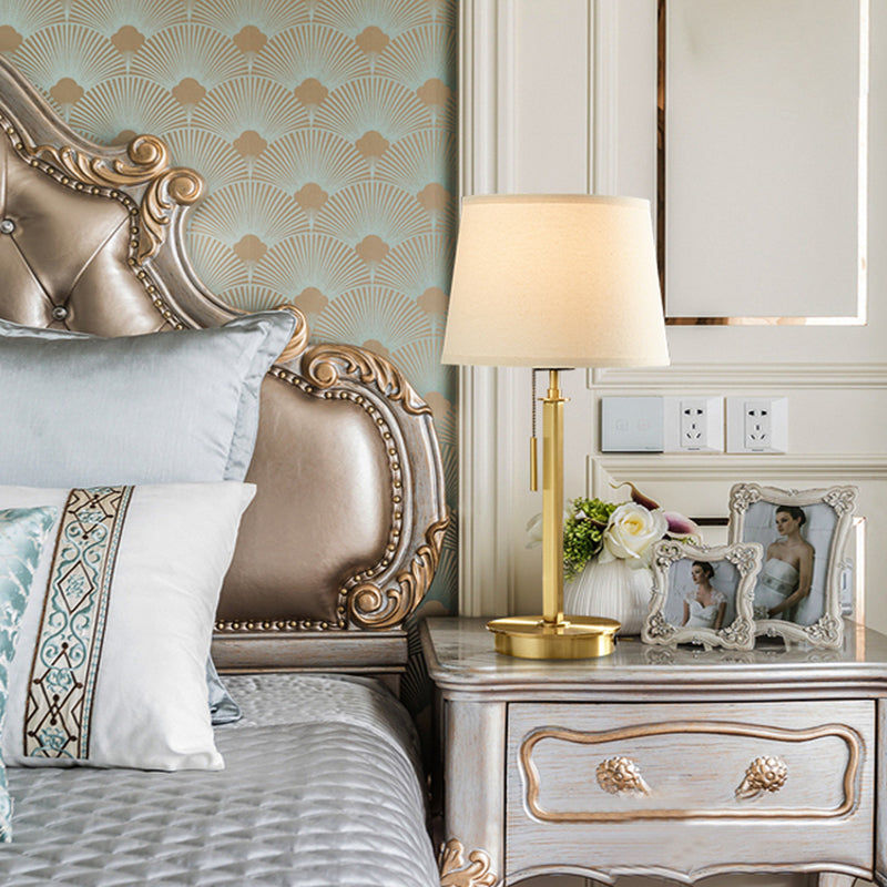 Modernist White Table Lamp with Pull Chain - Barrel Fabric Shade, 1-Head Nightstand Light