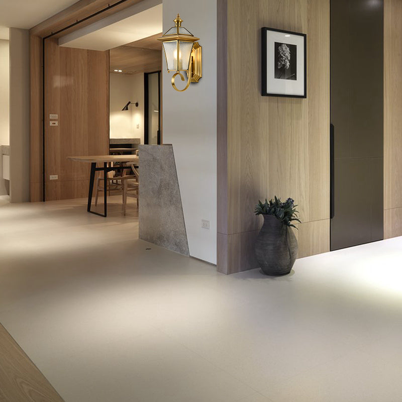 This wall light is a sconce designed in a colonial style with metal material. It has a backplate width of 4 inches and fixture depth of 7 or 8 inches, shade width of 6 inches, and height of 14 or 15 inches. The light type is LED/incandescent/fluorescent and the power source is direct wired electric. This sconce can be used indoor or outdoor and is available in brass.