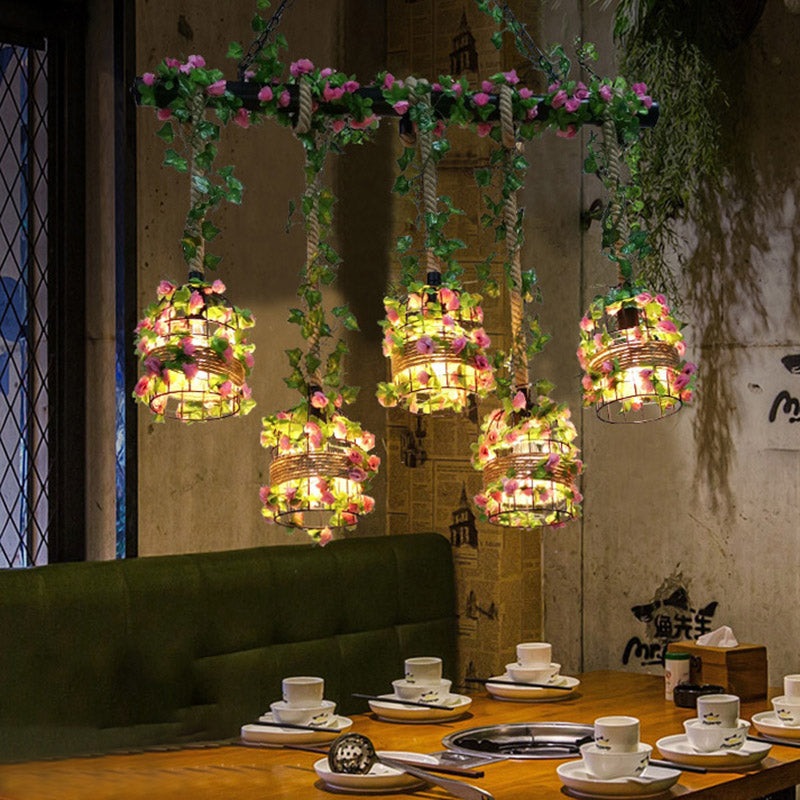Industrial Metal 5-Head Black Cage Island Lighting Fixture for Restaurants and Plants