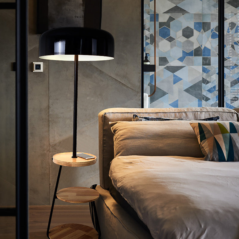 Modern Black Metal Floor Lamp With Wood Shelves - 2 Bulb Bowl Shade Light