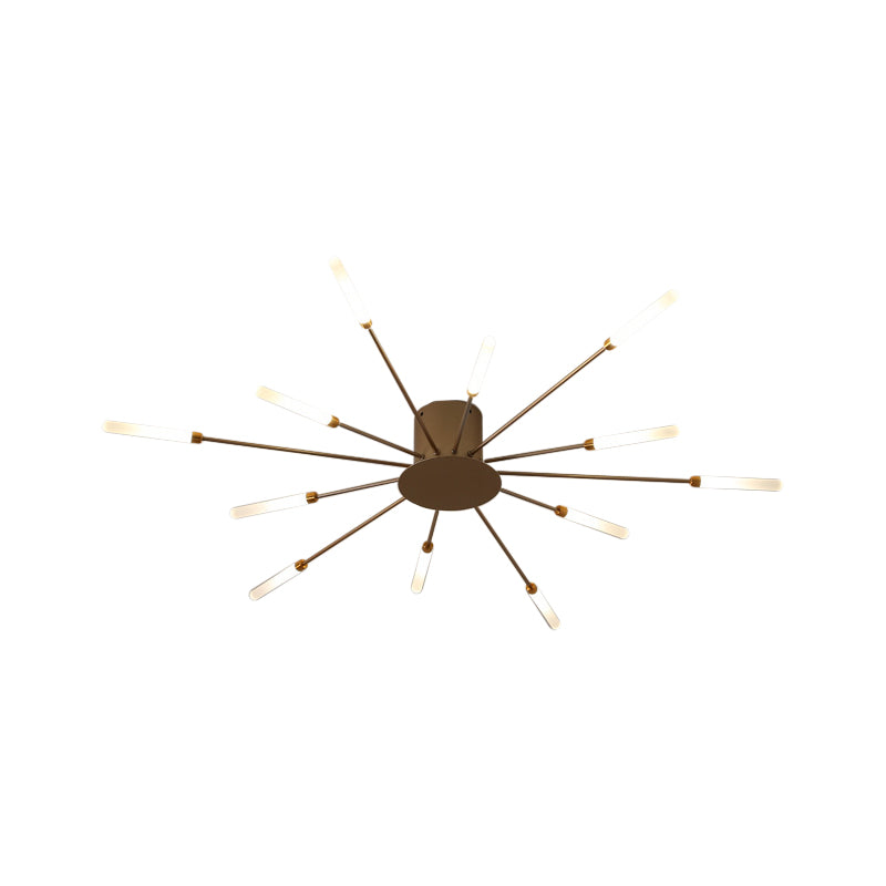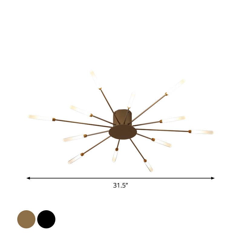 This product is a semi-flush ceiling light with a black and gold burst finish. It is made of metal with an acrylic LED light. It is a contemporary light with 12, 18, or 28 lights. The voltage is 110v-120v or 220v-240v. The light type is LED.
