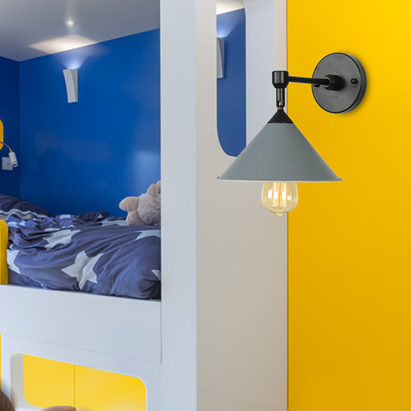 This wall light has a simple, modern style and comes in black, blue, gray, pink, and purple. It is made of metal and has one light. The light is either LED, incandescent, or fluorescent. It plugs in directly to an electric outlet and has a metal shade. The light is 8" tall and 8.5" wide. The shade is 5" tall and 5" wide. The backplate is 5" wide. This light does not come with a bulb.