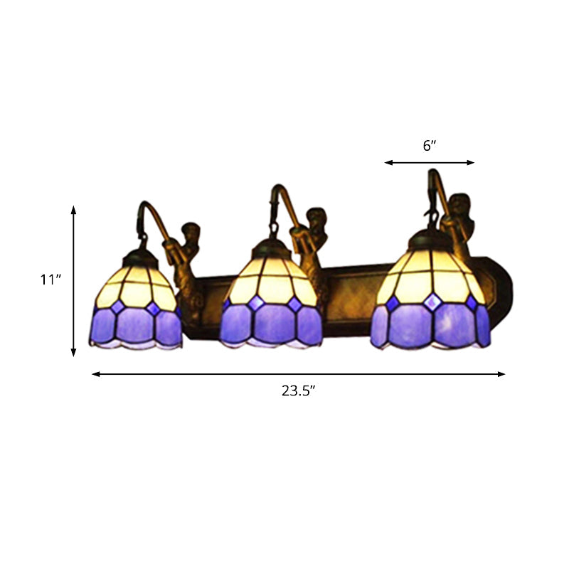 Blue Glass Grid Patterned Sconce Light - Tiffany 3 Head Antique Brass Wall Mounted Fixture