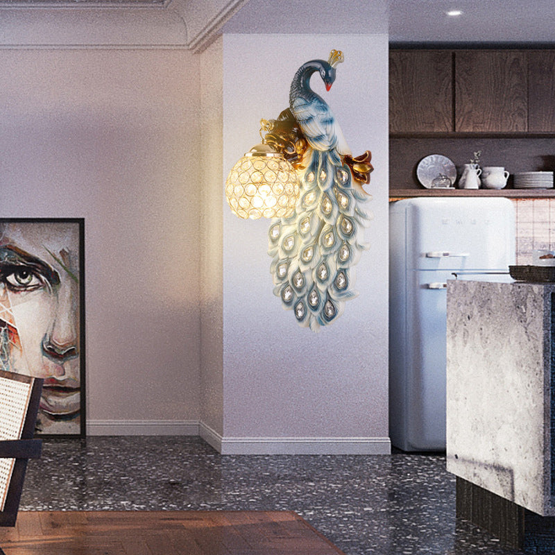 The Blue Peacock Sconce Light Fixture Country Resin Single Dining Room Wall Lamp with Crystal Shade is a wall light that features a peacock design. The light is made of crystal and resin, and it is a traditional style light. The light has a voltage of 220V-240V 110V-120V.