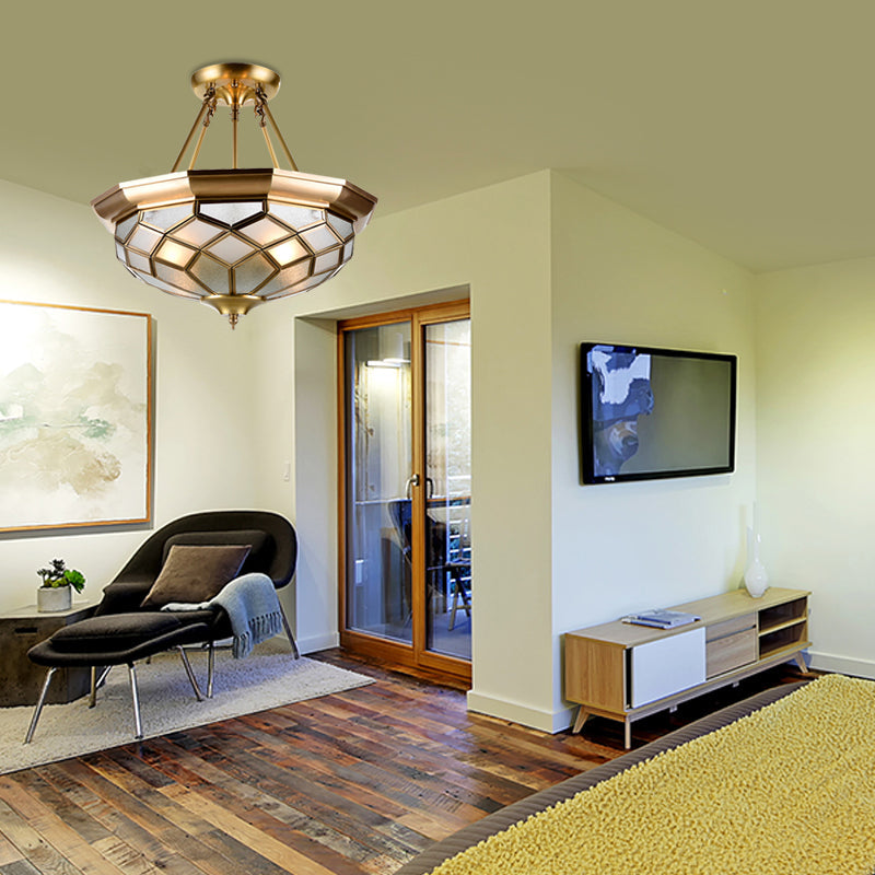 This semi-flush mount ceiling light fixture is made of brass and sandblasted glass. It comes in a colonial style with four or three lights, depending on the size you choose. This light is perfect for a dining room, as the glass dome casts a warm and inviting glow. It requires a E26/E27 bulb, is available in brass or chrome finishes, and is 220-240 volts or 110-120 volts.