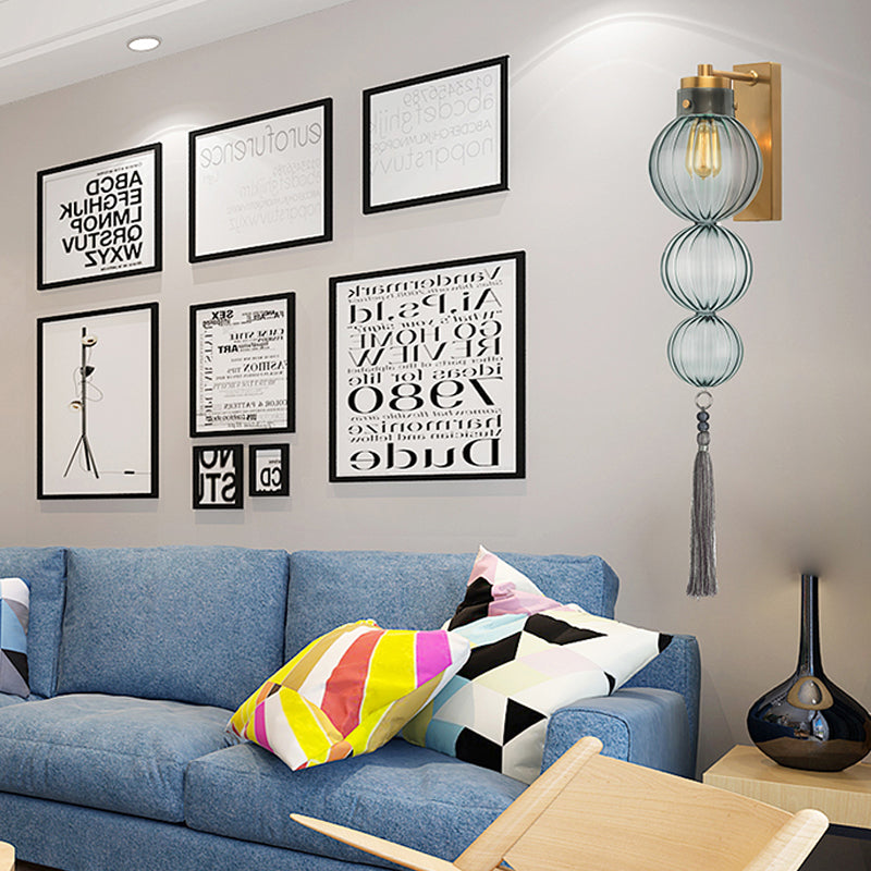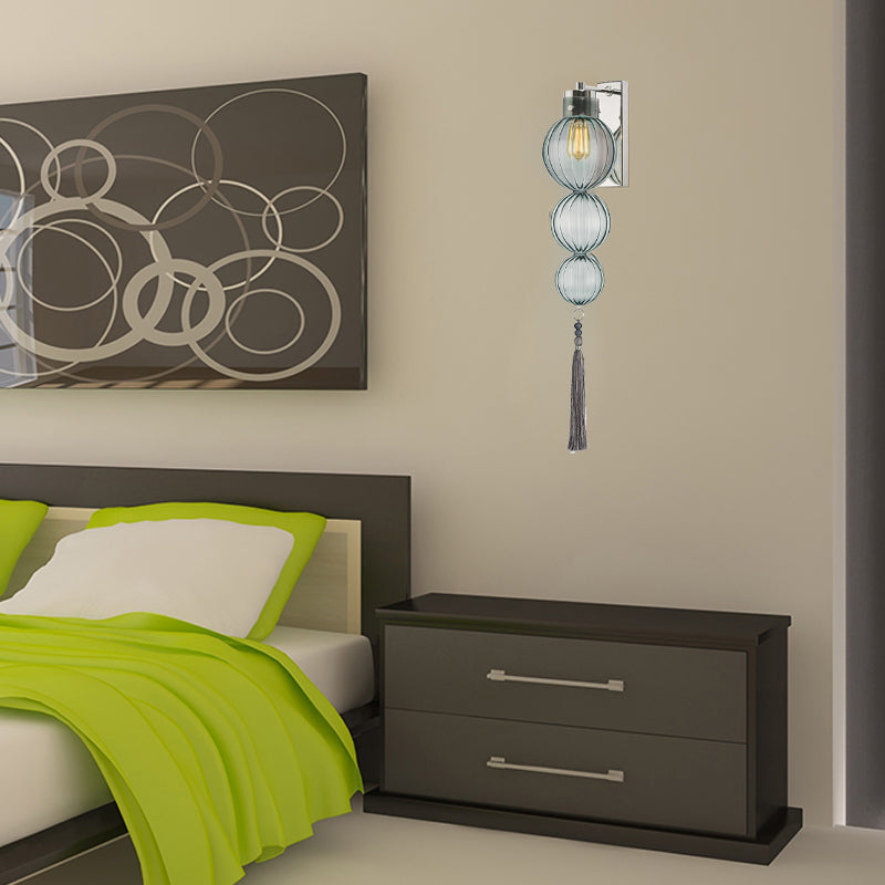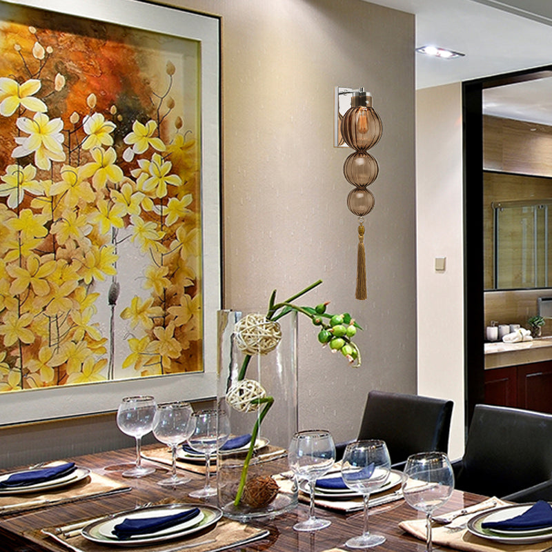 Chinese Style Brass/Chrome Sphere Sconce Light - Clear/Amber/Light Blue Glass Wall Mount Lamp with Tassel Knot