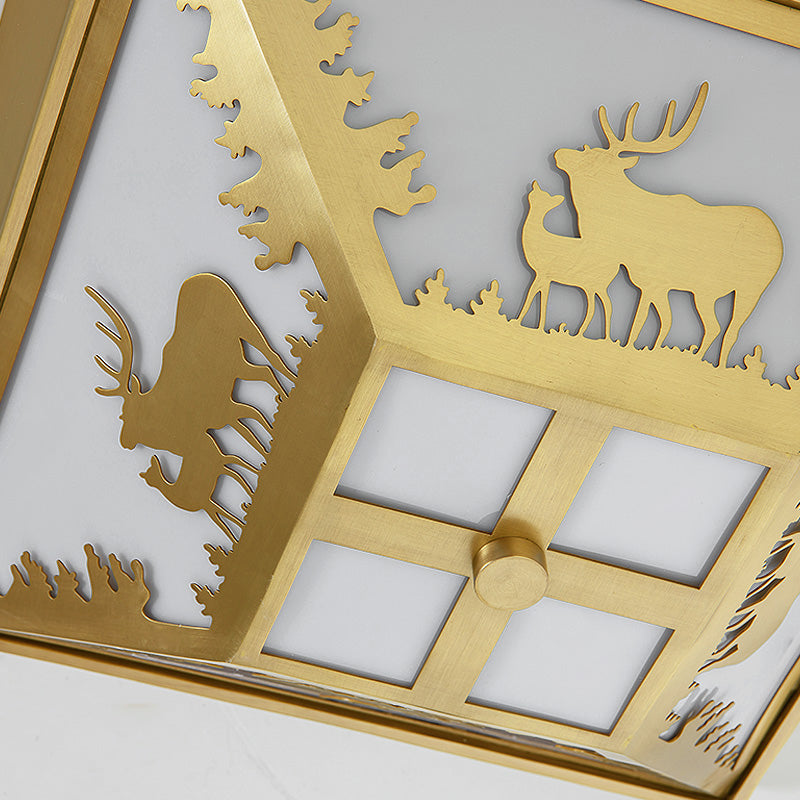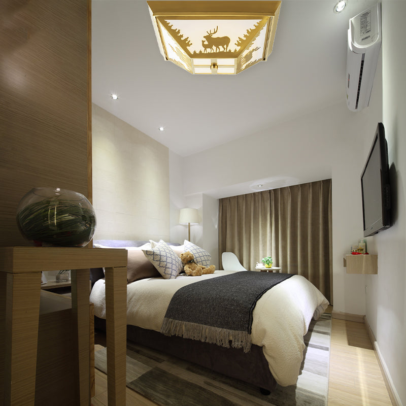This product is a traditional style trapezoid flush lighting fixture made from brass-finished metal. It is designed to mount on the ceiling and features 4 lights. The light bulbs are not included with the product, but it is compatible with E26/E27 base bulbs. You can choose between LED, incandescent, or fluorescent bulbs. The voltage for this product is 220V-240V or 110V-120V.