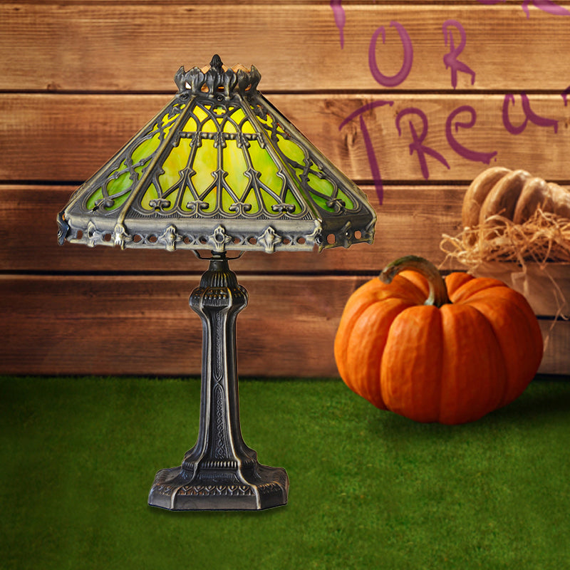 Mission Style Bronze Pyramid Nightstand Light with Green/Beige Glass - Ideal for Living Room