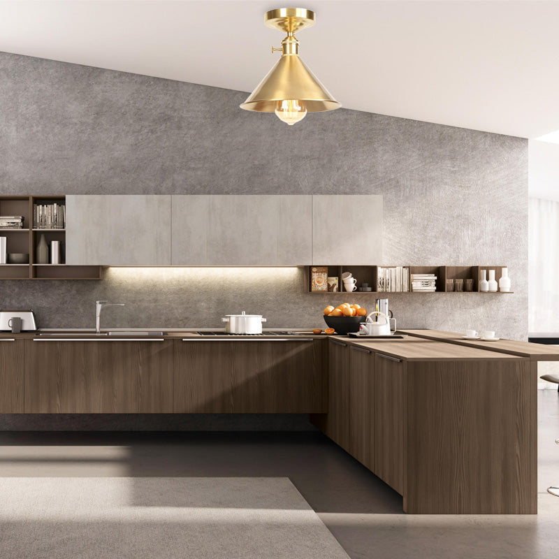 This Brushed Brass Conical Semi-Flush Light Vintage Industrial Metal 1 Light Balcony Ceiling Mounted Light is the perfect accent piece to make any room stand out. The sophisticated brushed brass finish combined with industrial metal make this light a perfect addition to any space. The conical shape and semi-flush design pairs well with modern or vintage decor, which is great for any area of your home. The fixture is 8"/9.5" wide and 8"/8.5" high so that it’s ideal for accenting any room. The canopy width is 4" and the light is compatible with E26/E27 type of bulbs and also with both voltage voltage, such as 220V-240V and 110V-120V. You can use LED, Incandescent or Fluorescent bulbs with this product. This light looks great on walls or ceilings, and is ideal for creating a warm and inviting atmosphere. It’s perfect for any home!