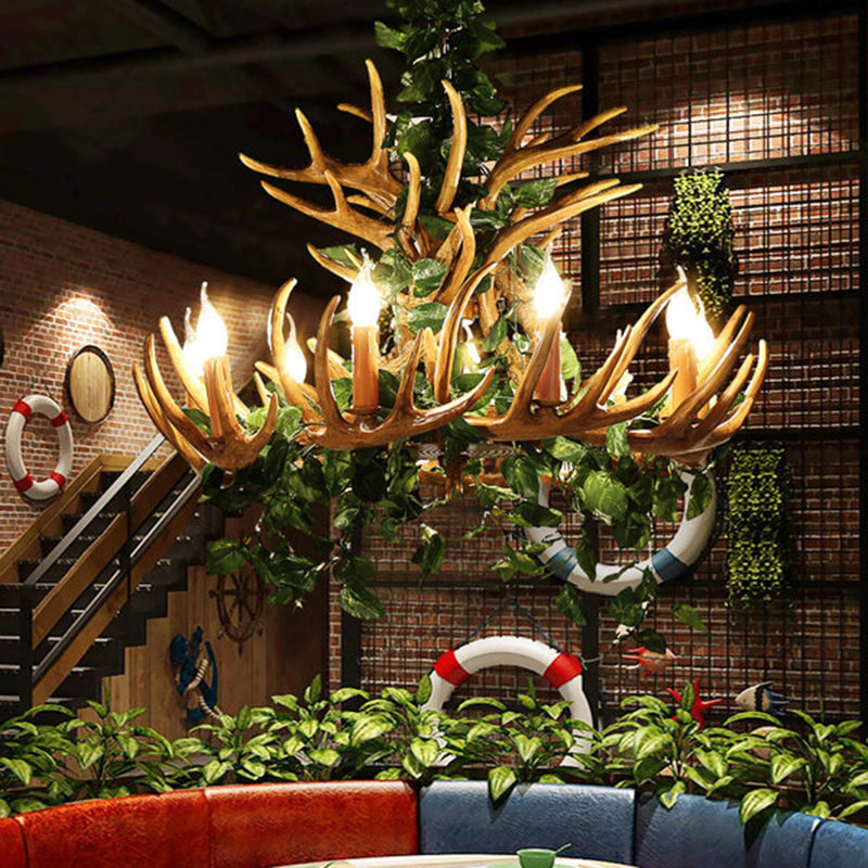This product is a hanging lamp that is rustic in style and made of resin. It is available in 4, 6, and 12 bulb versions and in pink or green colors. The chandelier is shadeless and has a round canopy. It is rated for use with 110v-120v or 220v-240v and has an E12/E14 bulb base.