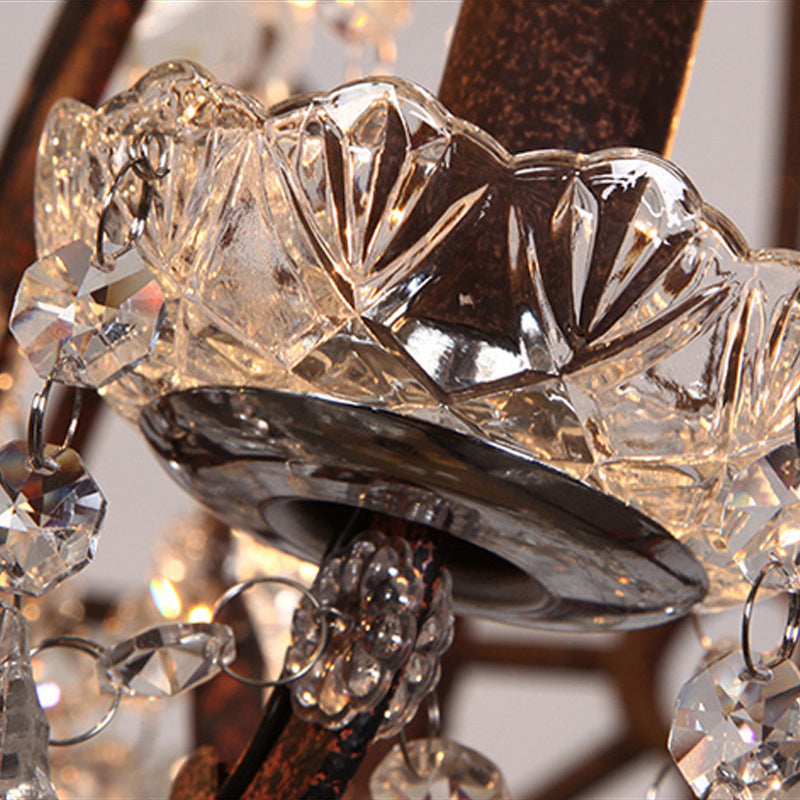 This chandelier is made of wrought iron with a rust finish and features crystal decorations. It is available in two sizes, 15 to 19 inches and 25 inches and above. The width of the fixture is 17 inches for the smaller size and 25.5 inches for the larger size. The height of the fixture is 17 inches for the smaller size and 25.5 inches for the larger size. The chain/cord length is 31.5 inches. This chandelier does not include bulbs. It has 6 lights for the larger size and 4 lights for the smaller size. The voltage is 220V-240V for the larger size and 110V-120V for the smaller size. The bulb base is E12/E14. The light type is LED/incandescent/fluorescent.