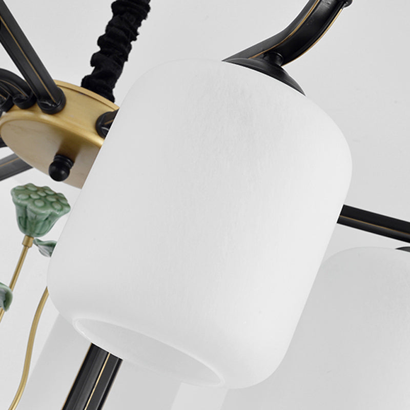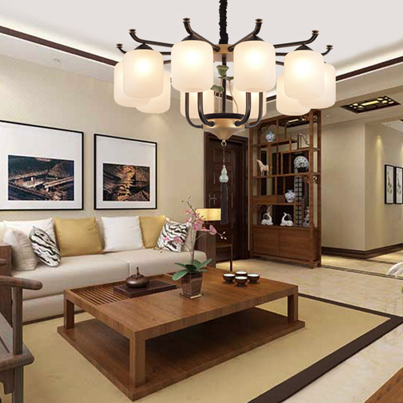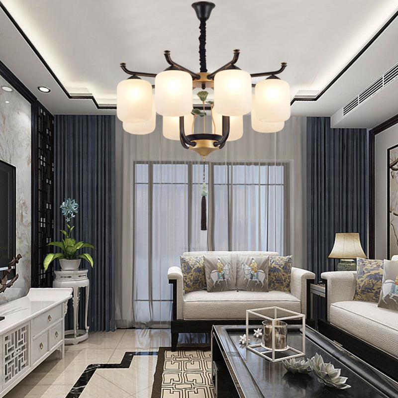 This chandelier is perfect for adding a touch of elegance to any room. The black metal frame is classic and traditional, while the frosted glass shade adds a touch of modernity. The chandelier comes in six, eight, or ten light variants and is compatible with both LED and incandescent bulbs.