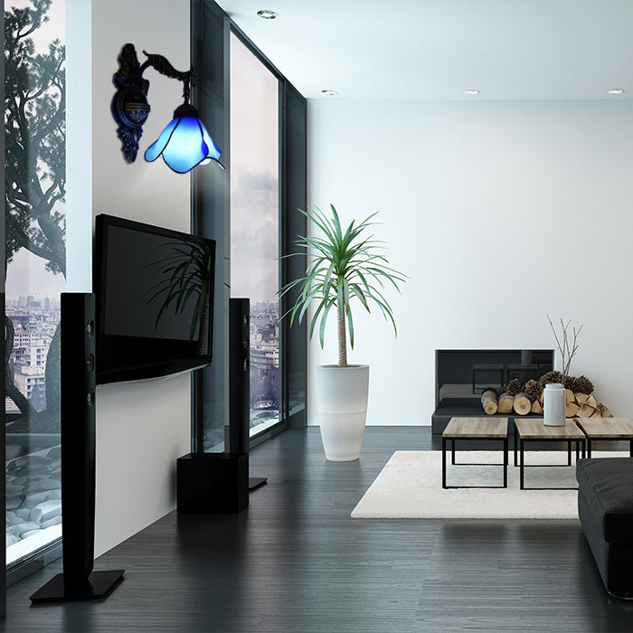 Tiffany Style Stained Glass Wall Sconce Light in Aged Brass - Clear/Pink/Light Blue/Dark Blue/Beige Petal Shade