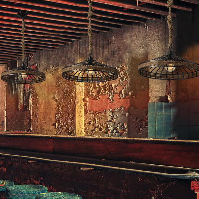 Vintage Rope and Metal Suspension Light for Restaurants - Conic Cage Design in Aged Silver/Black