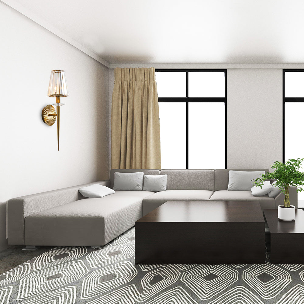 This wall light fixture is a statement piece that combines modern and elegant styling into one piece. The base is made of metal in gold finished. It has a crystal shade with its cone-shape design and intricate detail. The light comes with a E12/E14 bulb base, so you have the option to use either LED or Incandescent.