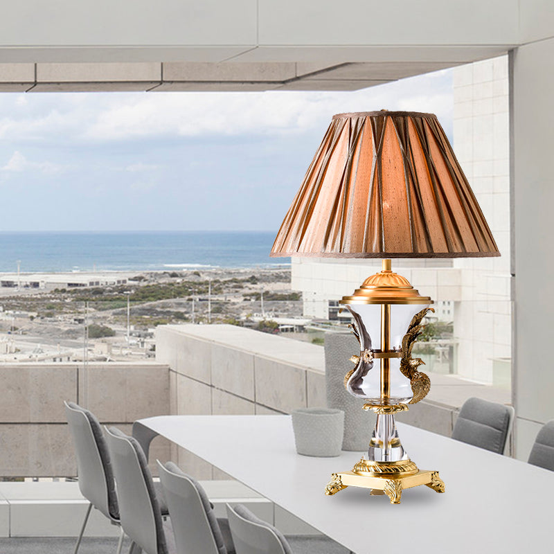 This table lamp has a sleek and modern design that will look great in any room. The light brown color and pagoda shape of the shade give it a warm and inviting look, while the crystal material adds a touch of elegance. The lamp is 18 to 19 inches long and has a fixture width of 18 inches. The height of the fixture is 26 to 30 inches. The shade is made of brown fabric and is brown in color. The bulb is not included. The lamp uses a standard E26/E27 bulb base and is compatible with LED, incandescent, and fluorescent bulbs. The voltage is 220V-240V 110V-120V.