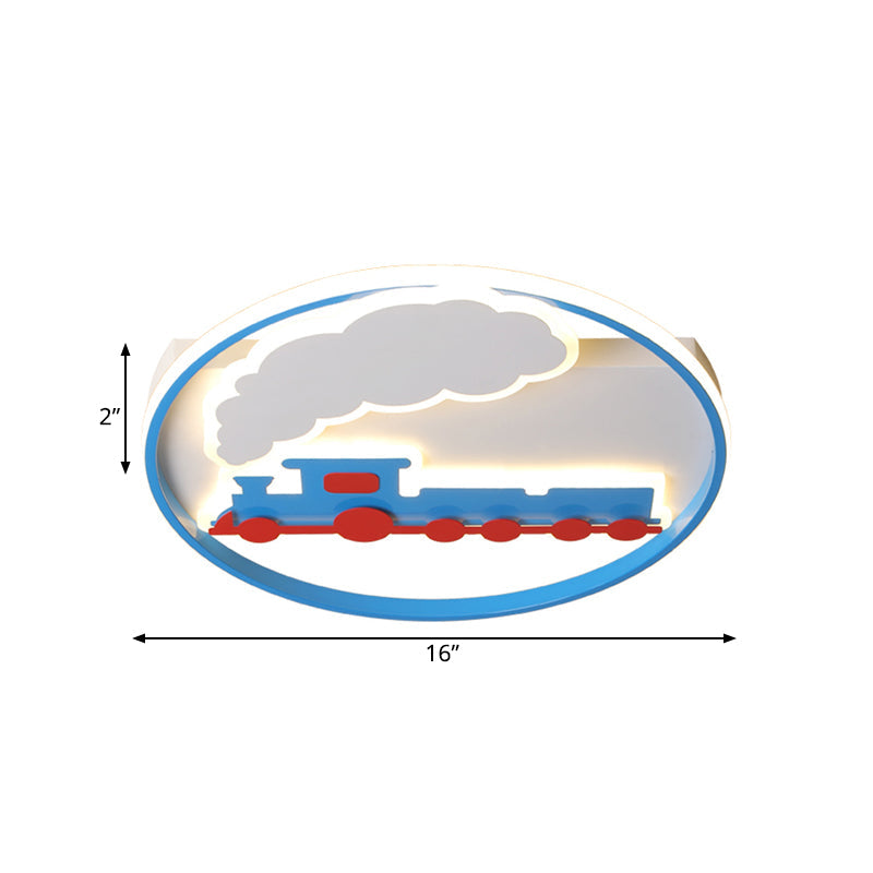 This is a contemporary looking flush mount ceiling light fixture designed to look like a train. It is made from acrylic and comes in a blue color. The light is LED and has a warm white color temperature. The light is designed to be kid's friendly with a playful style. The voltage for this product is either 220-240V or 110-120V. The bulb base is SMD.