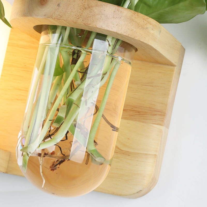 Art Deco Cream Glass Cube Sconce Lamp with Wood Wall Mount and Hydroponic Plant Pot