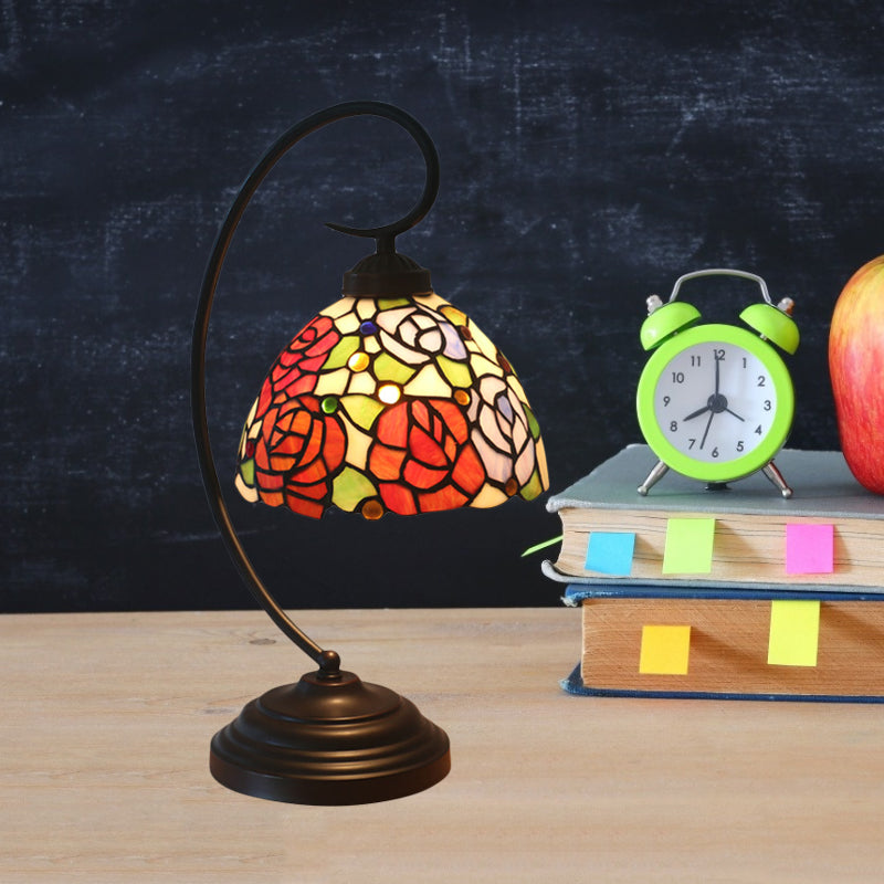 Hand Cut Glass Victorian Dome Shade Table Light with Rose Pattern - 1 Light Red/Orange Nightstand Lighting