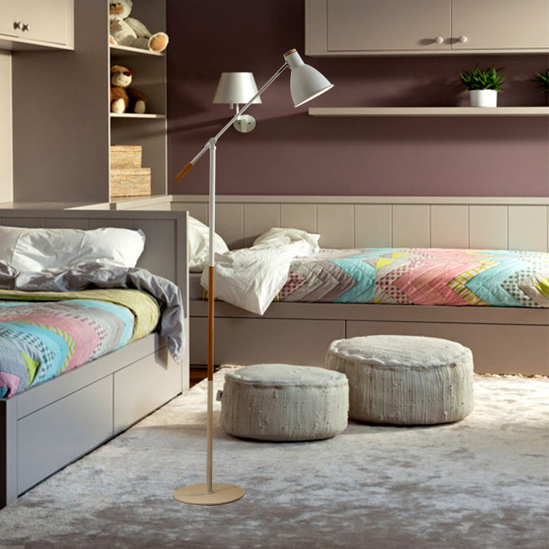 This is a floor lamp with a metal frame and modern design. The lamp is available in white or black and includes a balance arm. It is made of metal and has a domed shade. The shade is available in white or black. The lamp takes one bulb and is compatible with LED, incandescent, or fluorescent bulbs. The voltage is 220V-240V or 110V-120V. The lamp is 68" tall.