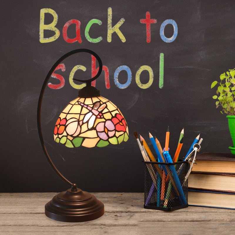 Mediterranean Cut Glass Domed Night Table Lamp - Dark Coffee Dragonfly And Flower Patterned Desk