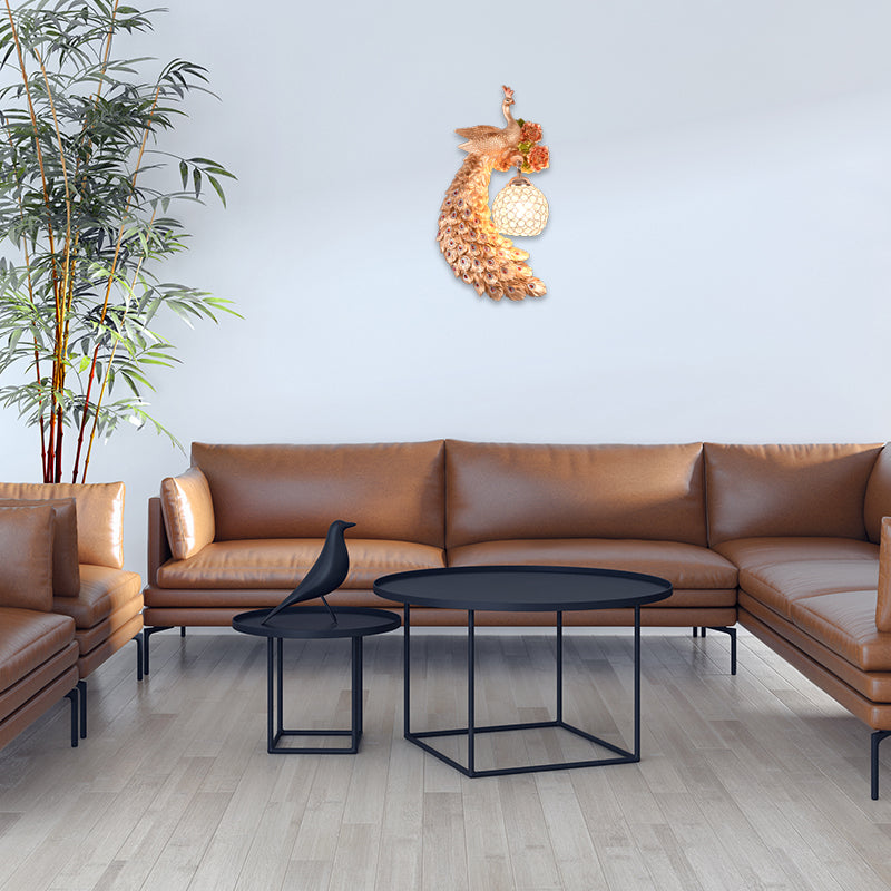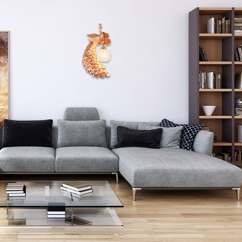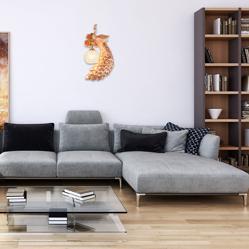 This wall light is in the shape of a peacock with its feathers spread out. The body of the light is white with gold accents, and the feathers are clear with a pink tint. The light comes with a metal shade that is in the shape of a dome. It has an E26/E27 base, so it can use either LED, incandescent, or fluorescent bulbs. This wall light is 15 to 19 inches in height and 8 to 12 inches in width. It is direct wired with an electric outlet, and it is made from resin. This wall light has a traditional style and is perfect for use in the home.