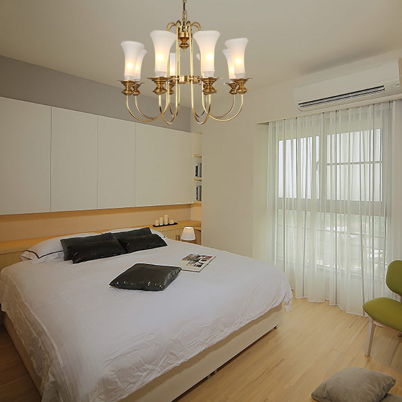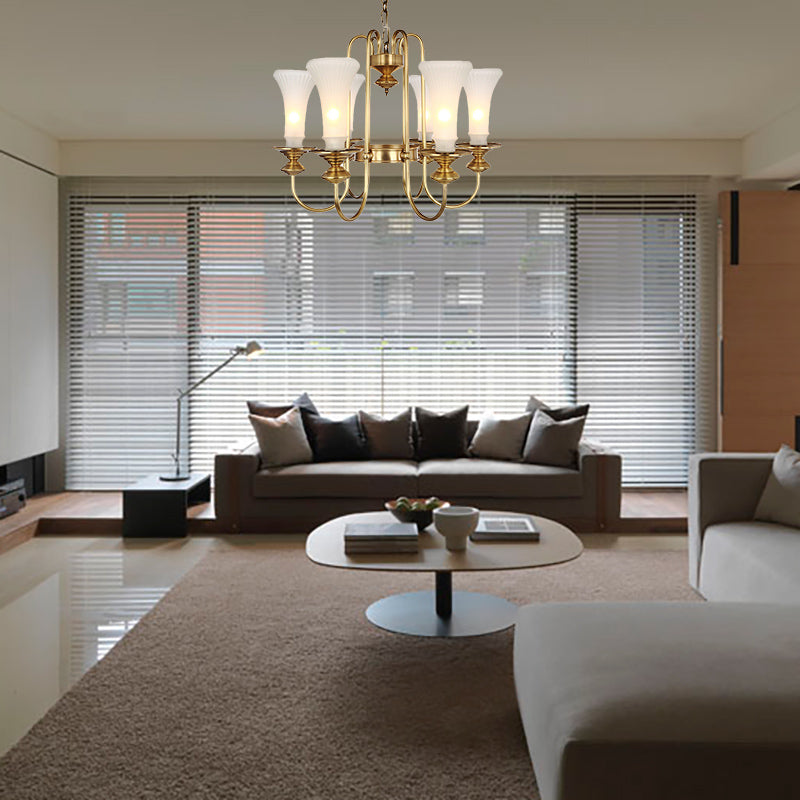 Colonial White Glass Floral Chandelier Light with Gold Accent - 3/6/8 Head Living Room Hanging Lamp Kit