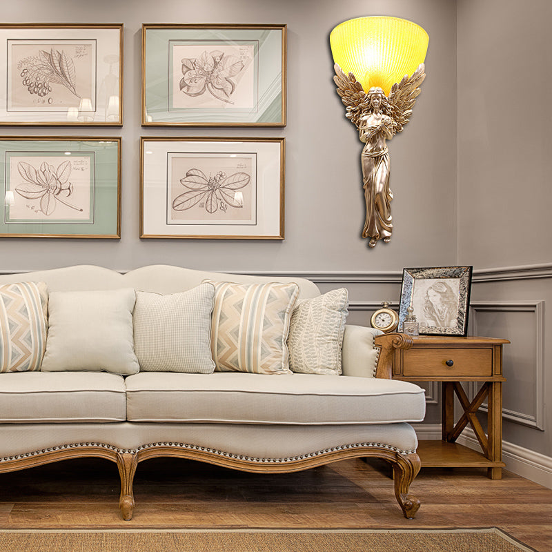 Country Style Resin Angel Sconce Light With Yellow Glass Shade - Gold/Silver/White Finish Gold