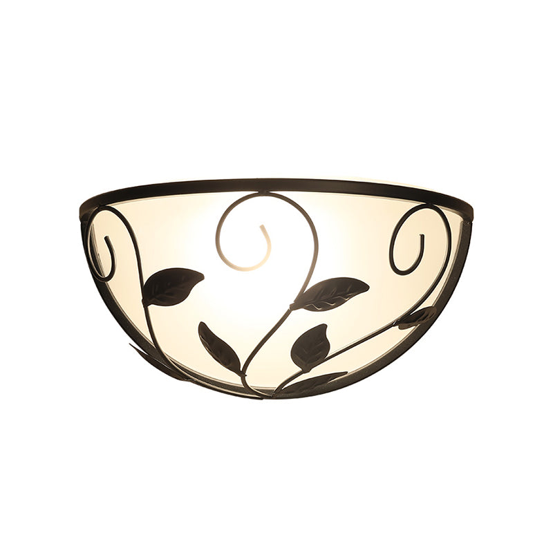 The Half Moon Bedroom Wall Sconce is a vintage white glass wall light with a black finish and leaf design. It has one light and is ideal for bedrooms, hallways, and other living areas.