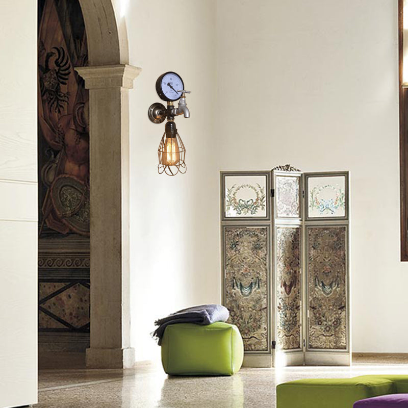 Silver/Blue Industrial Diamond Cage Wall Lamp with Gauge and Faucet - 1 Light Wrought Iron Wall Lighting