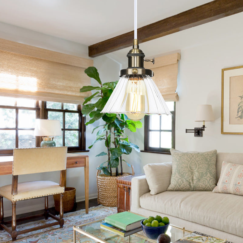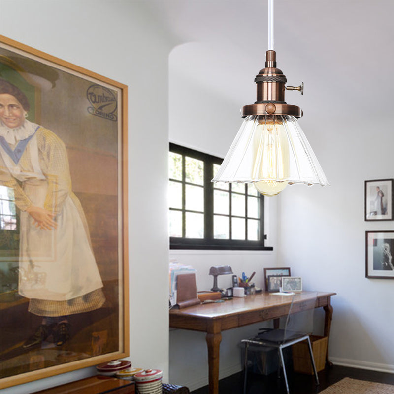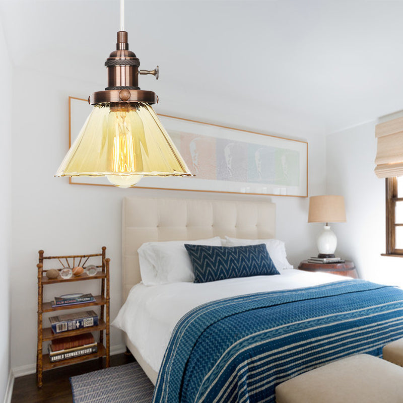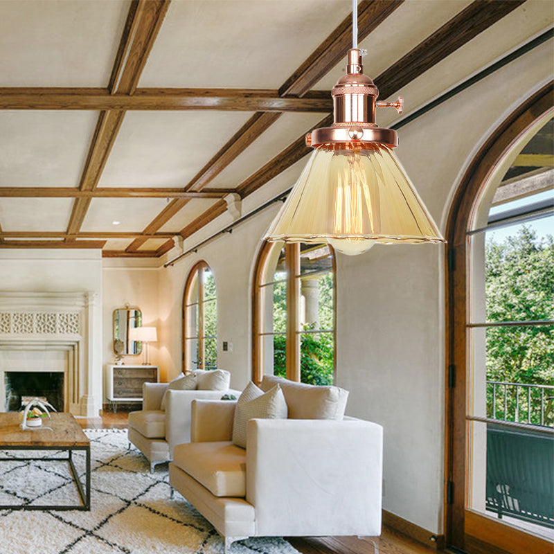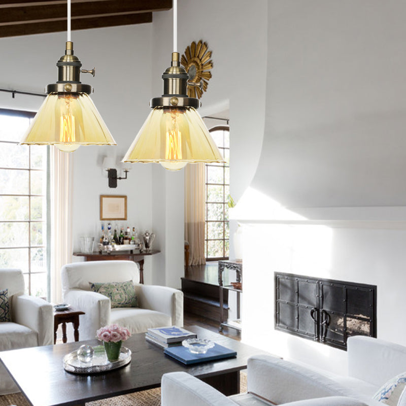 This industrial style conic hanging lamp is a perfect addition to any space in need of a light fixture. With its adjustable height, this pendant lamp is the perfect accent to any home, office, business, or restaurant. It features an amber and clear glass shade that is suspended by a 39-inch chain and canopy that comes in a variety of colors, such as bronze, brass, black, or copper. The light bulb is not included and will require an E26/E27 base bulb that is 110V-120V or 220V-240V. This lamp is ideal for any interior lighting needs, such as an LED or fluorescent light. Its size can range from 5 to 9 inches, with a fixture height of 6 inches, a width of 6 inches, and a Canopy Width of 5 inches. This industrial hanging lamp has a classic design with its metal material and is a great and stylish option for any room.