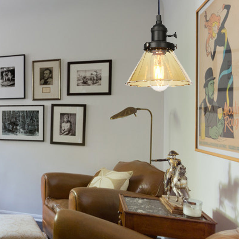 Height-Adjustable 1-Light Industrial Conic Pendant Lamp With Amber/Clear Glass For Coffee Shops -